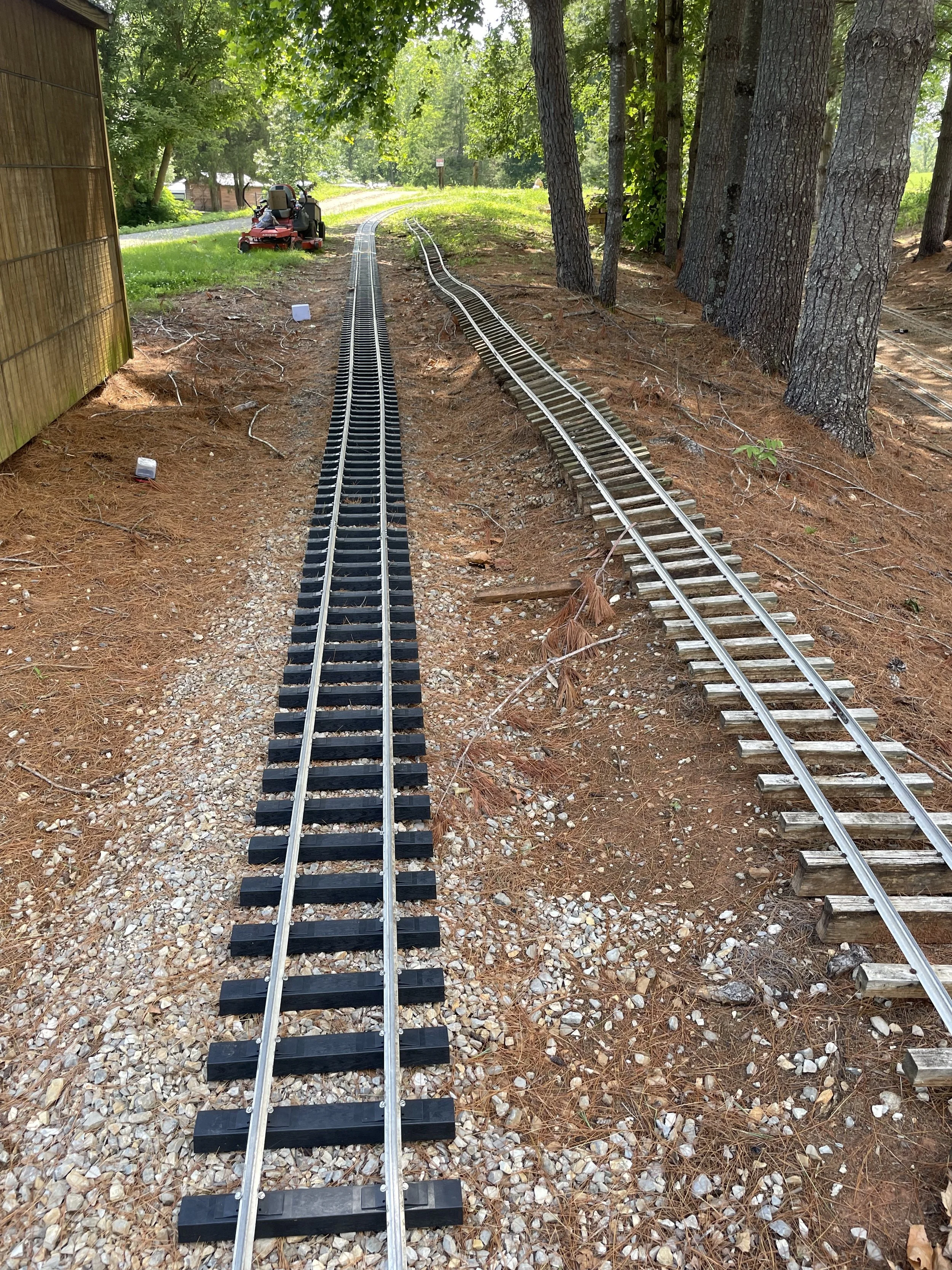 Good day at the track, got the grass mowed, and worked on the tree. Took up the last 70 ft of the old track then delivered the switch on our new main line bypass. Continued work on the tunnel and got a new delivery system on the tunnel.